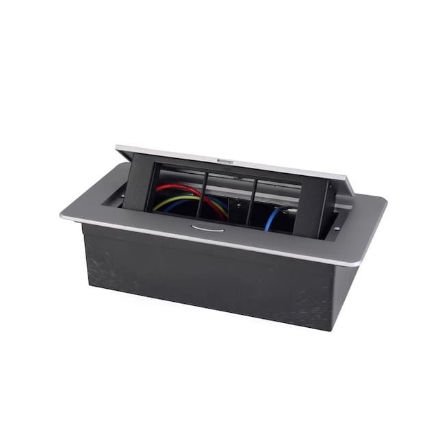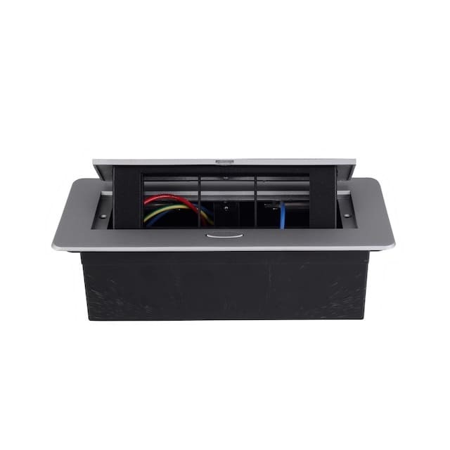 Лючок для розеток в столешницу на 3 поста - профессиональное решение для организации рабочих мест в открытых интерьерах, где требуется прямое подведение электропитания и информационных сетей на площади в удалении от основных стен.
