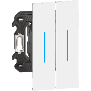 Коллекция серии Living Now от Bticino. Выключатель двухклавишный с подсветкой синего цвета и лицевой панелью белого цвета серии Living Now от Bticino - 2 модуля.