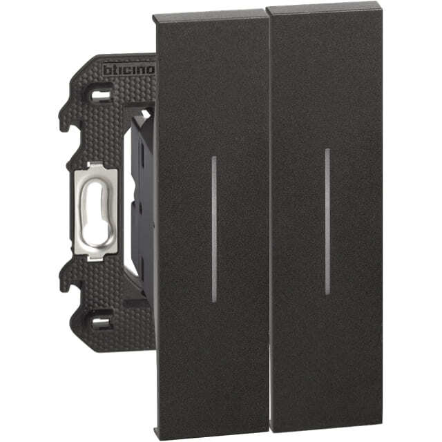 Коллекция серии Living Now от Bticino. Выключатель двухклавишный с подсветкой синего цвета и лицевой панелью чёрного цвета серии Living Now от Bticino - 2 модуля.
