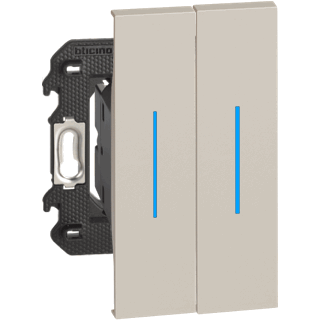 Коллекция серии Living Now от Bticino. Выключатель двухклавишный с подсветкой синего цвета и лицевой панелью песочного цвета серии Living Now от Bticino - 2 модуля.
