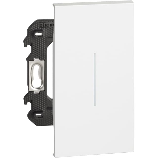 Коллекция серии Living Now от Bticino. Переключатель КНОПКА одноклавишный проходного типа с подсветкой синего цвета и лицевой панелью белого цвета серии Living Now от Bticino - 2 модуля.