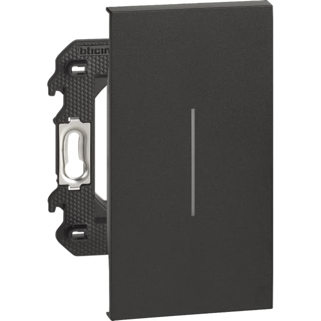 Коллекция серии Living Now от Bticino. Переключатель КНОПКА одноклавишный проходного типа с подсветкой синего цвета и лицевой панелью чёрного цвета серии Living Now от Bticino - 2 модуля.